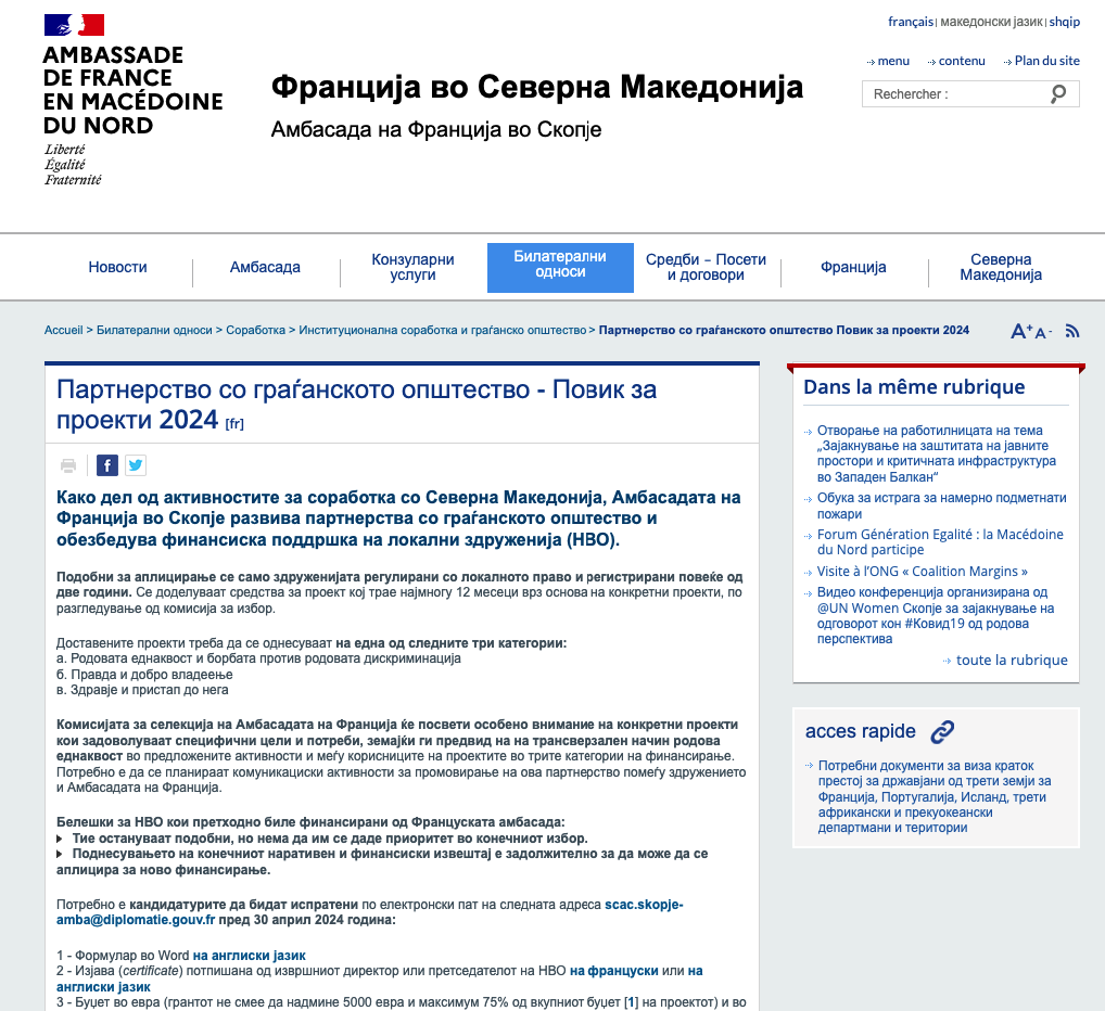 Како дел од активностите за соработка со Северна Македонија, Амбасадата на Франција во Скопје развива партнерства со граѓанското општество и обезбедува финансиска поддршка на локални здруженија (НВО).